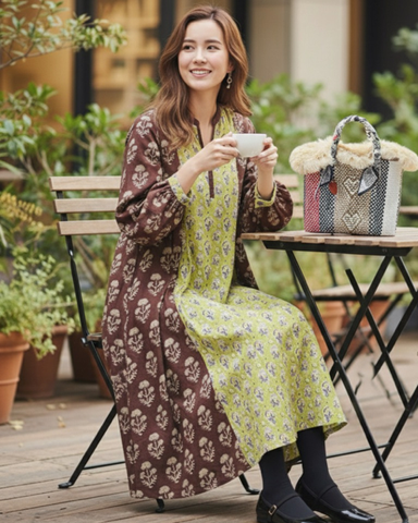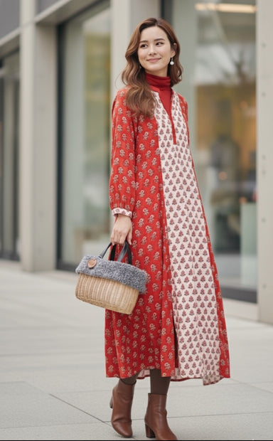 商品名 インドコットン切替プリントワンピース 色 Brown, Red ,Blue サイズ/寸法 【Free size】着丈:125cm 肩幅:42 cm バスト周り:100cm そで丈 :62cm 素材/材質 綿 100% 生産地 インド...