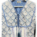 胸元にはステッチの加工が施してあり、濃い目のトリミングとタッセルが柔らかい雰囲気を引き締めています。インド綿はやわらかく、さらさらとした肌触りで、独特のシワ感や風合いがあり、様々な表情を演出してくれます。